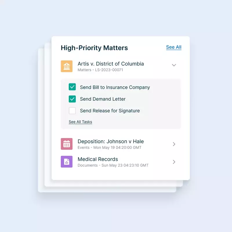Workflows and automation built to enhance your best practices, allowing your legal team to manage twice as many cases with the same resources.